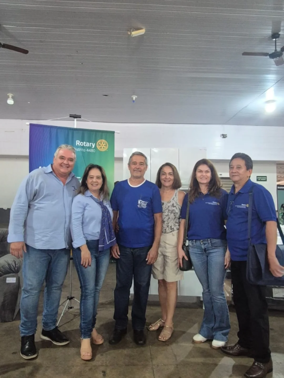 A imagem mostra um grupo de seis pessoas juntas dentro de casa. Eles estão posicionados em linha, com três pessoas de cada lado da figura central. Os participantes estão vestidos de forma casual, com alguns usando camisas azuis com logos ou textos. Atrás do grupo, há uma faixa com o logo do Rotary e o texto "Distrito 4480." O cenário parece ser um cômodo com ventilador de teto e luzes visíveis acima. A legenda menciona "rotary4480" e faz referência a Lelo Maset e Gerson Januário, associados ao Rotary International.
